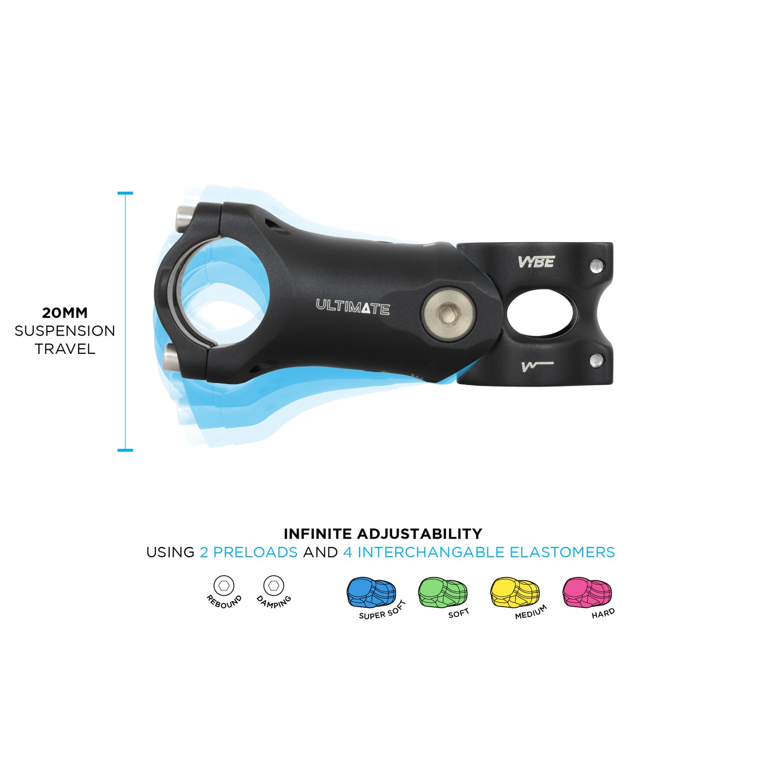 Featuring 20mm of active suspension travel, a choice of four elastomers to cater for different rider weights and preferences, plus the ability to fine tune the characteristics of the ride using two pre-load adjusters. The VYBE Suspension Stem absorbs bumps and vibrations with ease, removing chatter over rough terrain and providing a plush, connected feel to the trail, while also being controlled and refined on smoother surfaces. The result is reduced fatigue and greater enjoyment, wherever your adventure takes you.